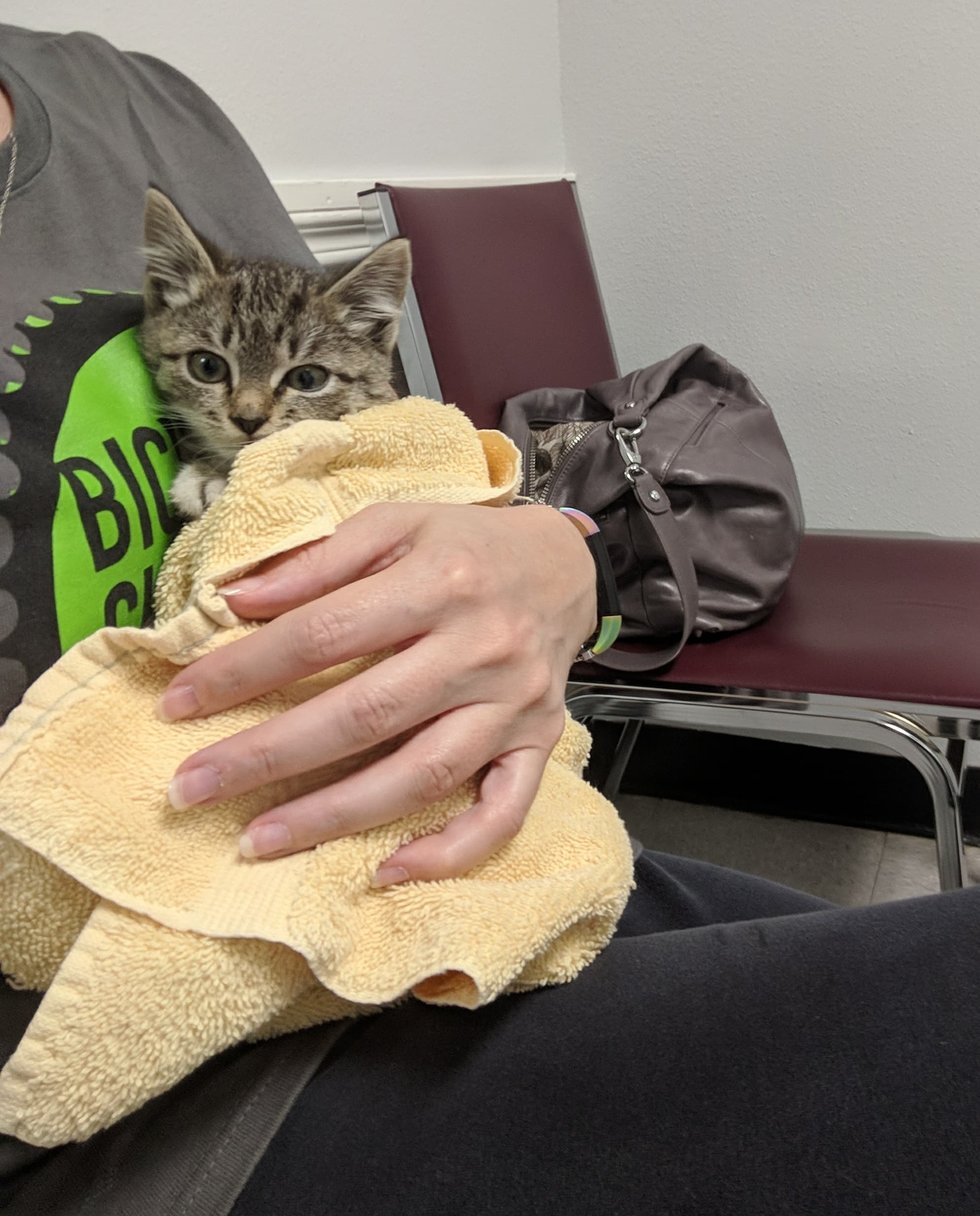 The terrified kitten stayed very still and quiet on Megan’s lap during the long drive home. “She was shaking a little in the car. I found her on a 5-lane freeway so my best guess is someone dumped her there.”