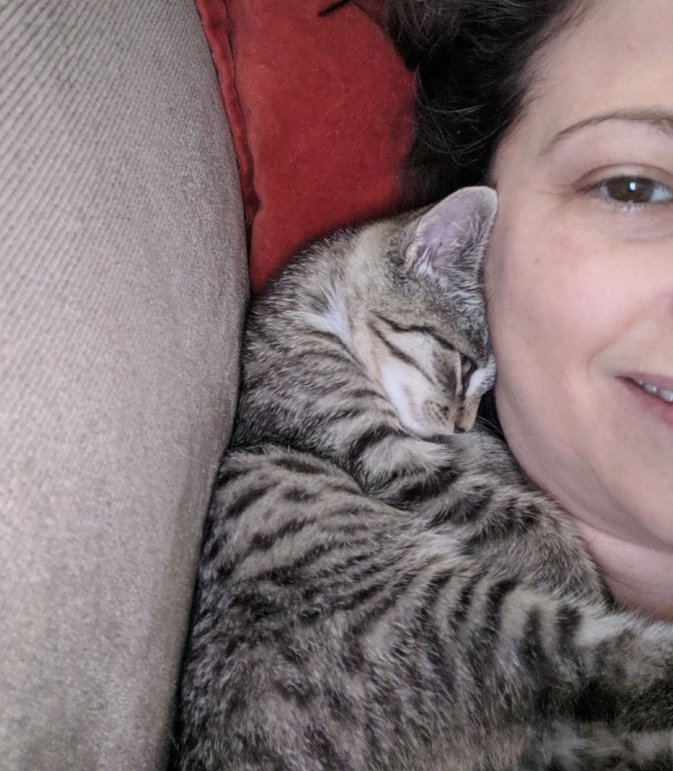 A week later, the tabby girl has made a complete 180 and constantly clings to her human mom for cuddles.
